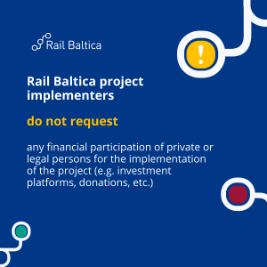 Also, the implementers of the Rail Baltica global project do not request, outside the legal obligations and formal project financing procedures, any financial participation of private or legal persons for the implementation of the project (for example, investment platforms, donations, etc.).