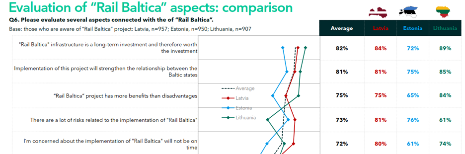 The survey findings indicate steady support for the Rail Baltica project since 2018, with an average of 69% of respondents from the three countries describing their attitude toward the project as positive.