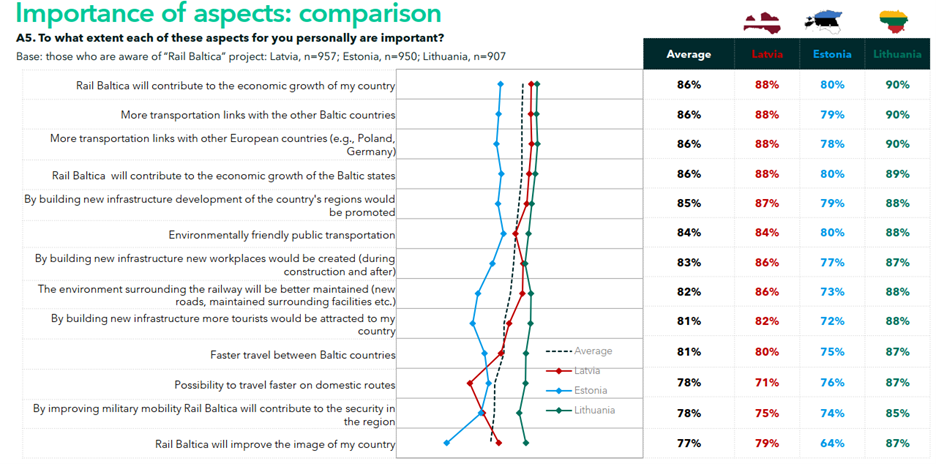 The survey identified several aspects of the Rail Baltica project deemed particularly important by Baltic inhabitants. These include the contribution to economic growth at both national and regional levels, the enhancement of transportation links within the Baltic states and with other European countries, and the promotion of environmentally friendly public transportation. The importance of these aspects varied slightly among respondents in each country, reflecting different priorities and perspectives.