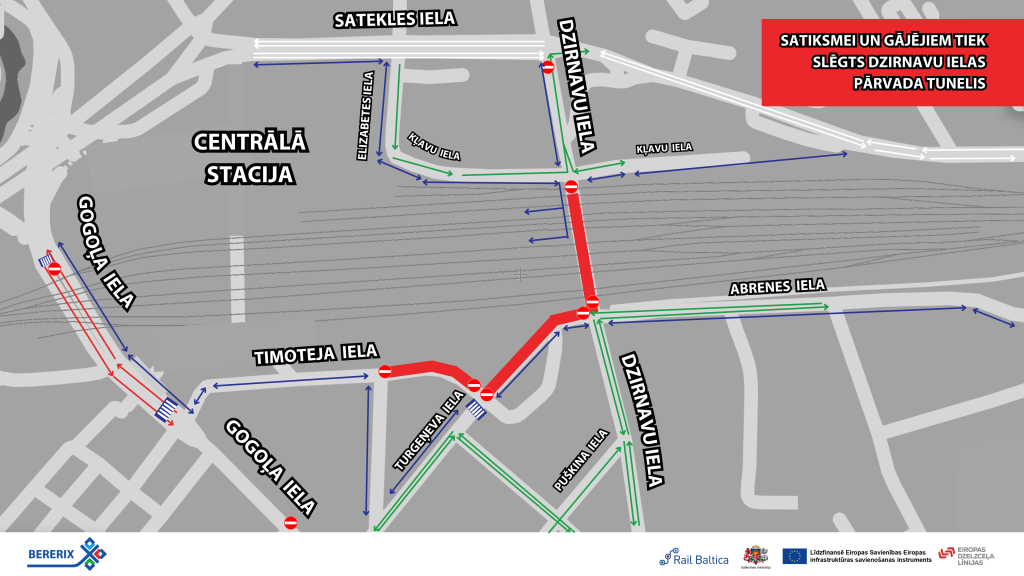 During the construction works of the newly built Dzirnavu Street railway infrastructure, all vehicular traffic and pedestrian flow will be completely closed in the construction zone. Car drivers, cyclists, and pedestrians are advised to follow the signs placed in the city and plan alternative routes for transportation in advance.