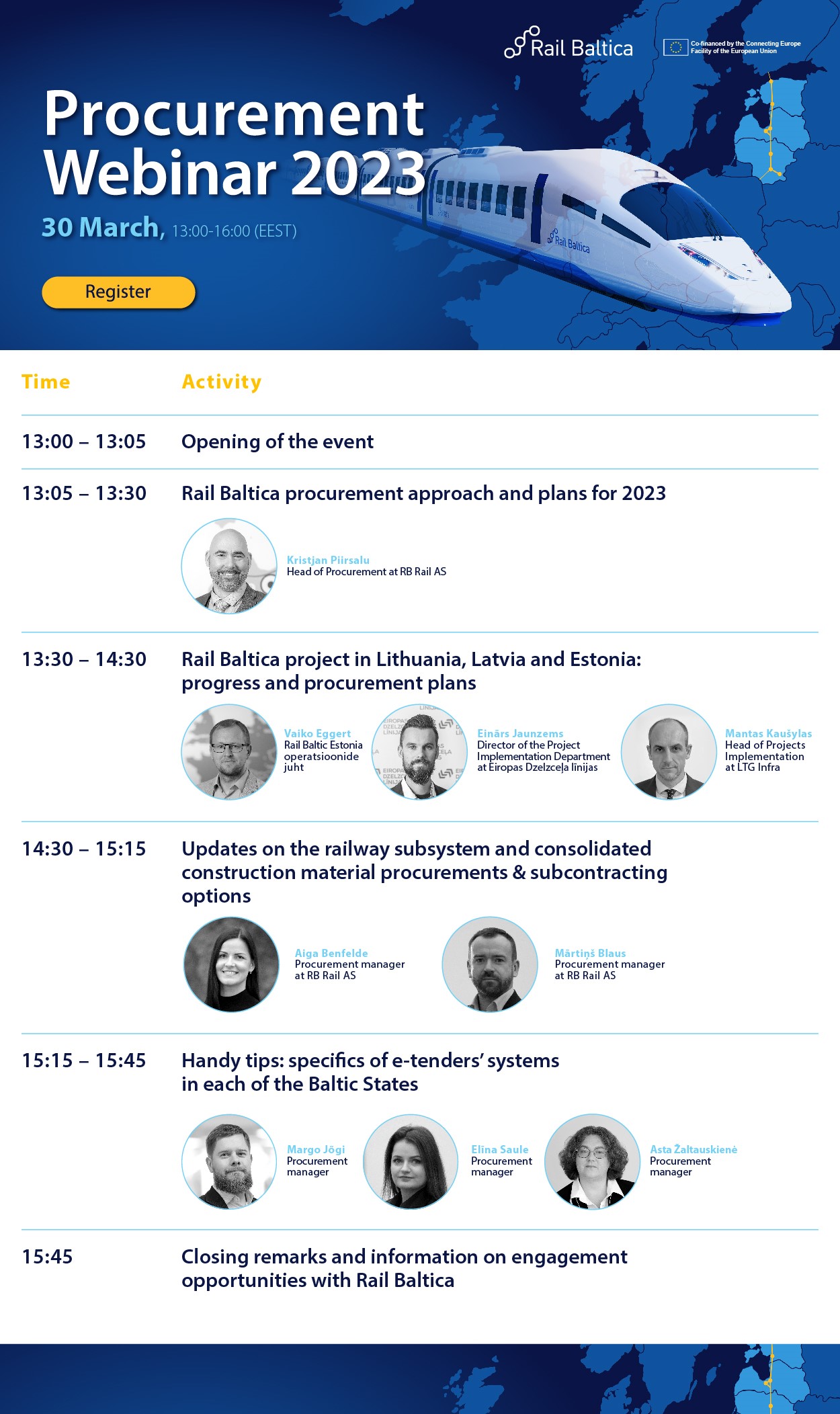 To inform potential suppliers and key partners about Rail Baltica procurement plans for 2023 and address supplier questions, the Rail Baltica Procurement Webinar 2023 is being broadcast live today March 30 from 13:00 until 16:00 (EEST).