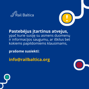 Atsižvelgdami į tai, norime priminti, kad projekto „Rail Baltica“ įgyvendintojai niekada neprašo ir nenaudoja bei neskelbia jokių asmens duomenų ar kitos informacijos projekto įgyvendinimo tikslais!