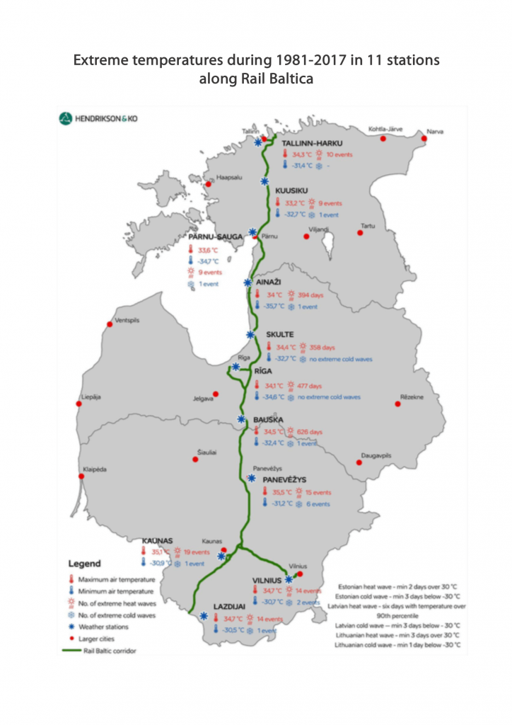 Visuomenei buvo pristatyta studija skirta įvertinti klimato kaitos poveikį „Rail Baltica“ projektui. Paremta pastarųjų 30-ies metų klimato ir oro duomenimis bei nacionalinėmis klimato kaitos prognozėmis, studija nustatė, kad Baltijos regiono žiemos taps šiltesnės, iškris mažiau sniego bei dažniau susidursime su šlapdriba, snygiu ir apšalu. Vasaros metu tikimasi dažnesnių karščio bangų, o didžiausia oro temperatūra gali pasiekti ir iki 40 laipsnių šilumos. Anot studijos, tikėtina, kad dėl aukštesnės oro temperatūros dažniau susiformuos tipiniai vasariški audros debesys ir išaugs vėjo greitis. Tai reiškia, kad regione padaugės stiprių liūčių ir audrų, tačiau šių reiškinių ilgalaikes tendencijas sunku įvertinti tiksliai.