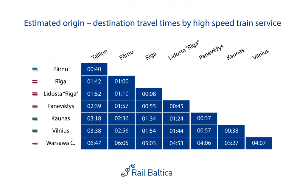 Numatyta, kad greitieji „Rail Baltica“ traukiniai iš Talino į Varšuvą ir iš Talino į Vilnių pradėjus veikti linijai kursuos keturis kartus per dieną, o dešimties metų laikotarpyje šis skaičius išaugs iki šešių traukinių. Papildomai, Vilnius-Kaunas-Varšuva maršrutu per dieną kursuos net iki 10 traukinių. Todėl, „Rail Baltica“ užtikrins greitųjų traukinių susisiekimą tarp Baltijos šalių sostinių kas dvi valandas.
