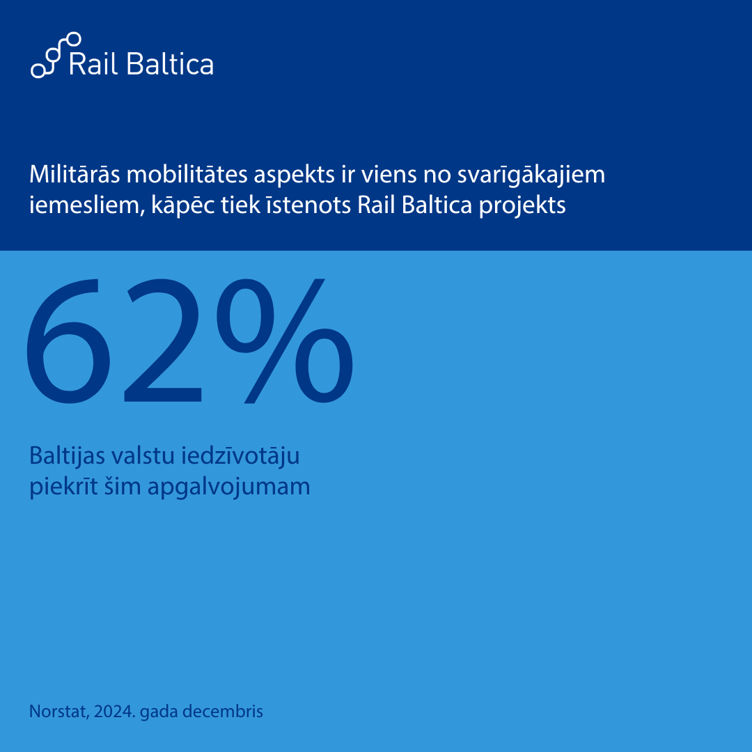 “Projekts sākotnēji tika iecerēts kā ilgtspējas iniciatīva, galvenokārt koncentrējoties uz pasažieru un kravu pārvadājumiem, taču Krievijas pilna mēroga iebrukums Ukrainā 2022. gadā ir mainījis tā nozīmi. Tagad tas nav tikai par ātrāku un ērtāku pārvietošanos – tas ir arī veids, kā demonstrēt ES solidaritāti ar tās austrumu dalībvalstīm un palīdzēt pārorientēt kravu plūsmas reģionā, kur tirdzniecības ceļi ir izmainīti. Šīs aptaujas rezultāti parāda, ka Latvijas, Lietuvas un Igaunijas iedzīvotāji izprot Rail Baltica stratēģisko nozīmi, kas sniedzas tālāk par civilā transporta priekšrocībām,” norāda RB Rail AS valdes locekle Kitija Gruškevica. “Kā mūsdienīgs ātrgaitas dzelzceļa savienojums ar Eiropu Rail Baltica būtiski uzlabos mūsu spēju ātri pārvietot militāro personālu un aprīkojumu, kad tas būs nepieciešams.”