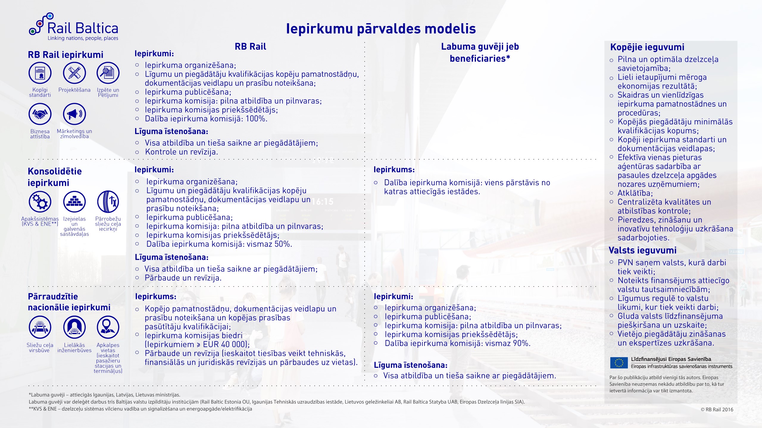 Iepirkumu procesa pamatnostādnes, institūciju lomas un atbildības sadali nosaka Rail Baltica projekta finansēšanas un izpildes modelis, kas ieviests, savstarpēji vienojoties kopuzņēmumam, labuma guvējiem un nacionālajiem ieviesējiem.