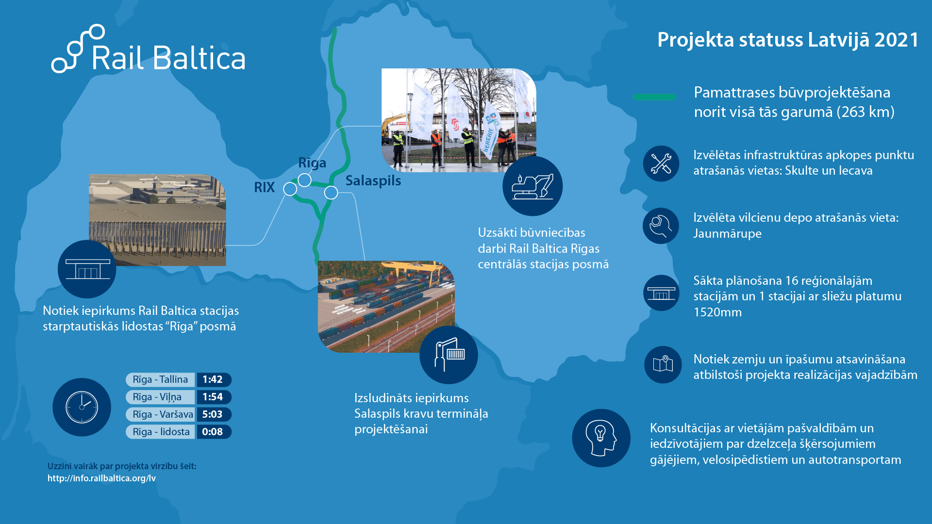 2020. gads iezīmēja Rail Baltica būvniecības darbu sākumu visās trīs Baltijas valstīs. 2020. gada 17. novembrī, uzsākot būvdarbus vienā no divām Rail Baltica starptautiskajām stacijām Latvijas teritorijā – Rīgas Centrālajā stacijā –, Latvija pievienojās abām pārējām Baltijas valstīm, kur jau uzsākti Rail Baltica infrastruktūras būvdarbi. Igaunijā pirmais būvobjekts – ceļa viadukts uz Tallinas apvedceļa Saustinemmē – jau tuvojas noslēgumam. 2021. gadā tam sekos arī vairāku citu ceļa infrastruktūras objektu būvniecība. Tāpat arī Lietuvā notiek būvdarbi Kauņas apvedceļa atjaunošanai. “Līdz ar to varam apgalvot, ka 2021. gadā, kas turklāt ir Eiropas dzelzceļu gads, Rail Baltica infrastruktūras būvniecība ir sākusies visās valstīs,” komentē Ģirts Bramans, RB Rail AS reģionālais vadītājs Latvijā.