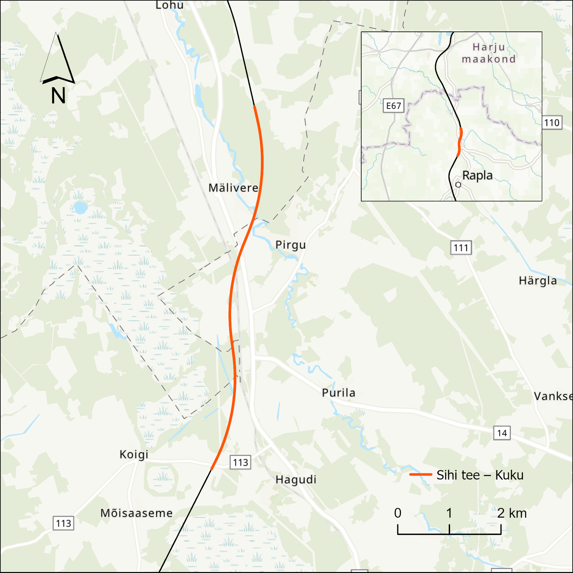In the Loone-Hagudi section, the future Rail Baltica railway line intersects with the existing Edelaraudtee corridor. The construction of the Pureva railway viaduct will divert the Edelaraudtee over the Rail Baltica track. In total, six major structures (including Edelaraudtee facilities) will be built in this section: the Keila River railway bridge with a length of 224 meters; the Mälivere road viaduct with a length of 111.76 meters; the Pureva railway viaduct with a length of 107.03 meters (Edelaraudtee); the Tamme railway viaduct with a length of 16.40 meters; the Röa eco-duct with a length of 115.45 meters (on the RB railway infrastructure); the Röa eco-duct with a length of 113.50 meters (Edelaraudtee).