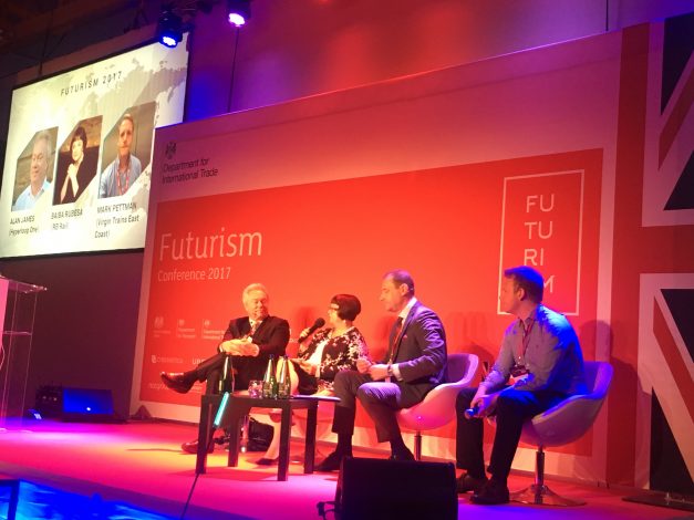 Futurism Conference 2017, Tallinn, September 7, 2017. From left: Alan James (Hyperloop One), Baiba Rubesa (Rail Baltica), Tonis Tamme (TRINITI), Mark Pettman (Virgin Trains East Coast) -