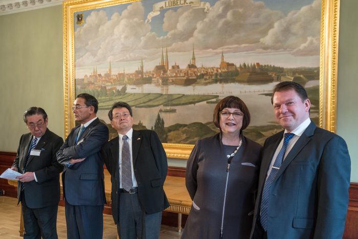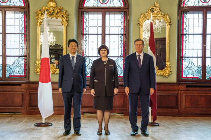 Shinzo Abe, Prime Minister of Japan, Baiba Rubesa, CEO of RB Rail, and Māris Kučinskis, Prime Minister of Latvia.