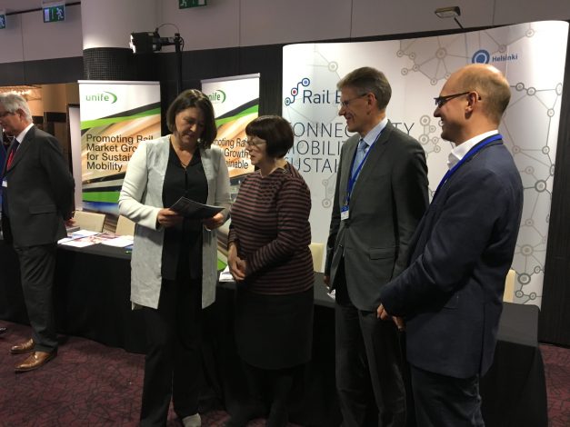 Commissioner Violeta Bulc visits Rail Baltica stand and meets with Baiba Rubesa, CEO of RB Rail and other management members -